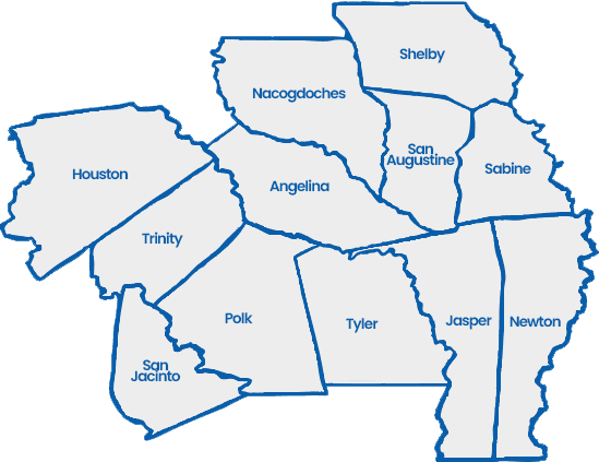 Communities Unlimited presta sus servicios en el profundo este de Texas, centrándose en los siguientes condados y sus comunidades: Angelina, Houston, Jasper, Nacogdoches, Newton, Polk, Sabine, San Augustine, San Jacinto, Shelby, Trinity y Tyler. Empresarios y pequeñas empresas que busquen préstamos para pequeñas empresas, pónganse en contacto con nosotros para conocer sus opciones. ¡Hablemos!